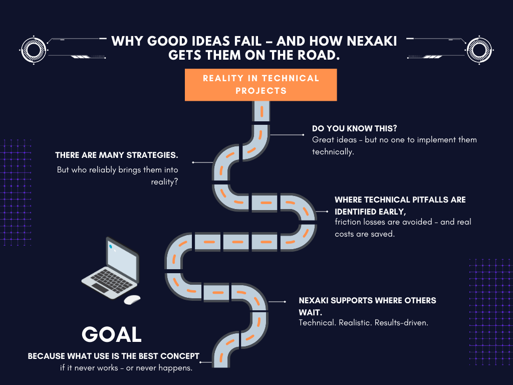 NEXAKI stands for execution with substance – grounded, responsible, and with a clear focus on results. We take technical ownership and deliver where others merely plan.